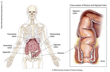 این تصویر ۵ بخش کولون و رکتوم را نشان میدهد. کولون صعودی ابتدای روده بزرگ است و روده کوچک در آن تخلیه میشود. از سمت راست پایین شکم شروع میشود و سپس به روده بزرگ عرضی منتهی میشود. کولون عرضی، از سمت راست به چپ از بالای شکم عبور میکند و به کولون نزولی منتهی میشود، که مواد زائد را به سمت چپ میبرد. در نهایت، کولون سیگموئید در پایین، چند اینچ بیشتر، تا رکتوم، ضایعات را میبرد. تصویر بالا، مقطعی از رکتوم و کولون سیگموئید نشان میدهد که مواد زائد از طریق مقعد از بدن خارج میشوند.